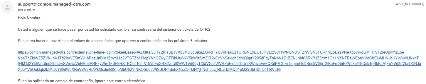 Ves a la teva safata d'entrada i busca el correu electrònic de recuperació. Assegura't també de revisar la carpeta de correu no desitjat per si de cas. L'assumpte del correu hauria de ser "Solicitud de nueva contraseña sistema de tickets cdmon OTRS":